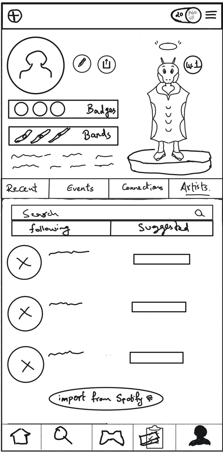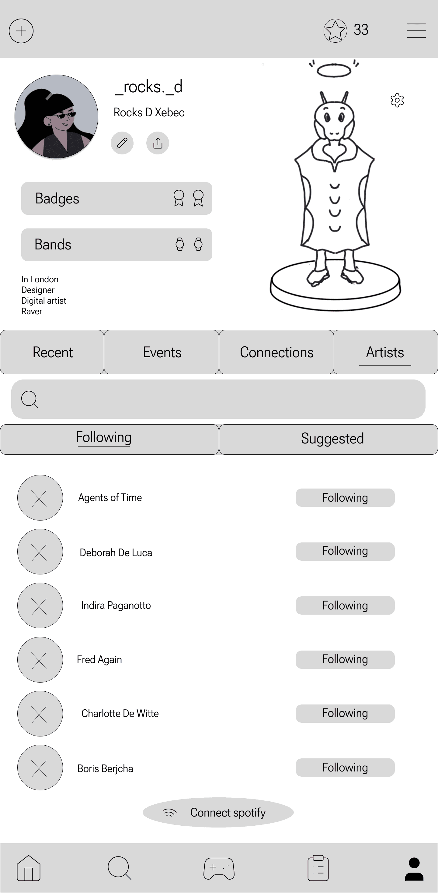 Participants explored the profile page, managing their musical journey, tracking events, and integrating Spotify accounts. The Instagram-like interface was intuitive, allowing smooth interaction with the app's diverse features. The prospect of avatar customization and following artists excited users, who appreciated the personalized recommendations based on their preferences.