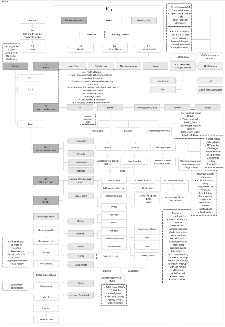 The sitemap provides a clear graphical overview of our festival app's structure, showcasing its pages and features. Designed for easy navigation, it ensures an intuitive user experience, enhancing engagement and optimizing festival attendees' participation.