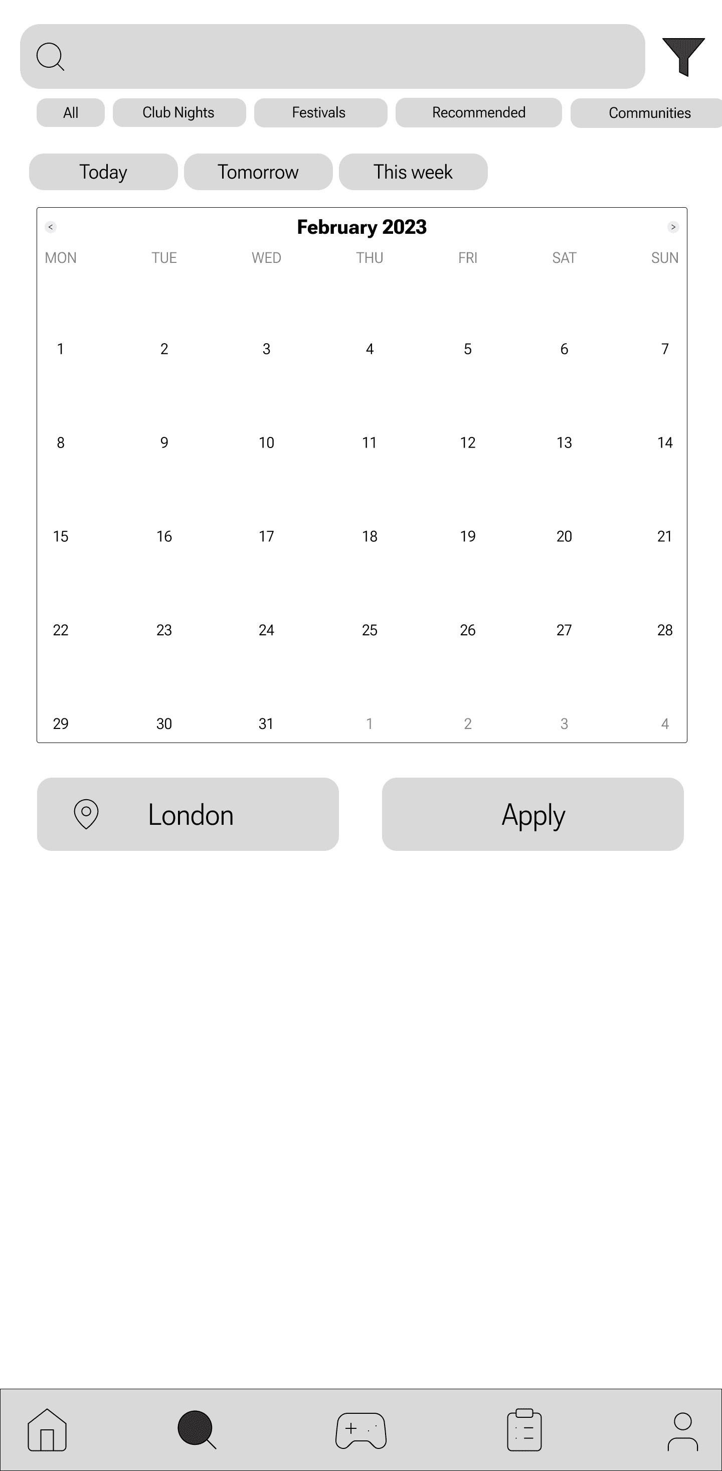 The Discover page allows users to search for events and apply filters to refine their results. The design prioritizes ease of use and quick access to relevant information.