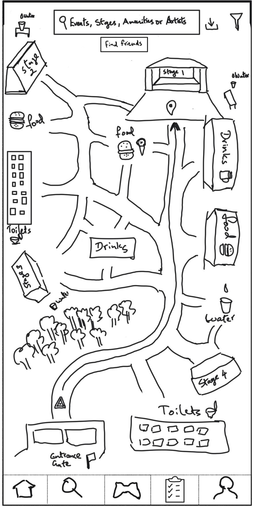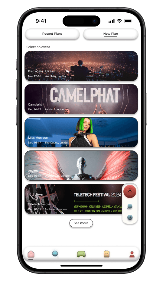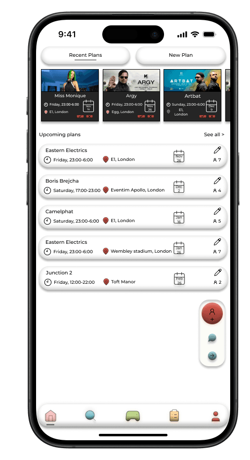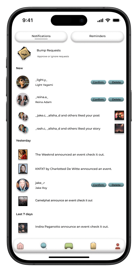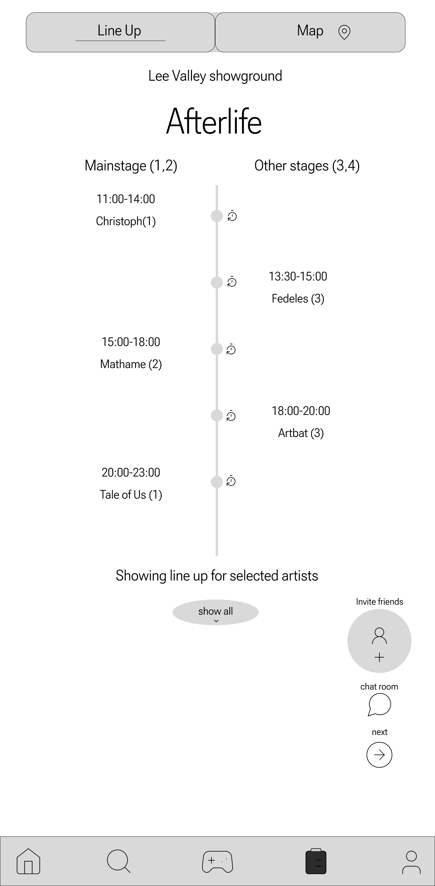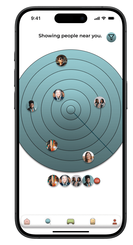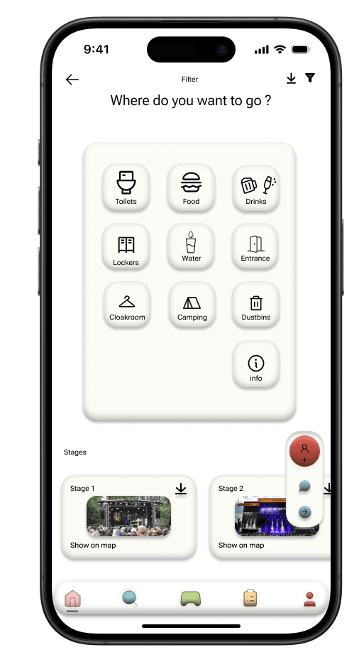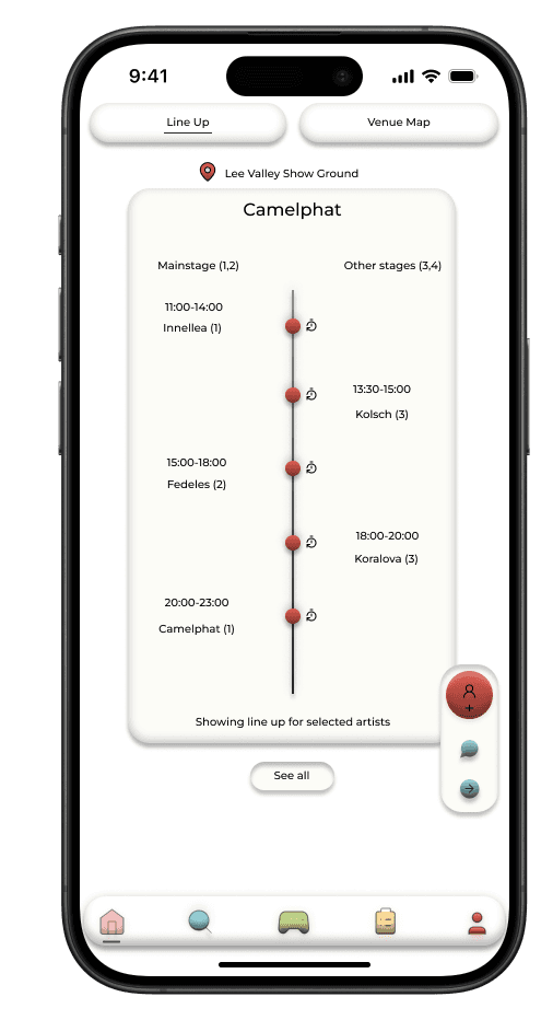 This feature was designed to help festival-goers easily connect with others nearby. The navigation bar's handshake icon, symbolizing connection, resonated with users, making the social focus of the app clear.