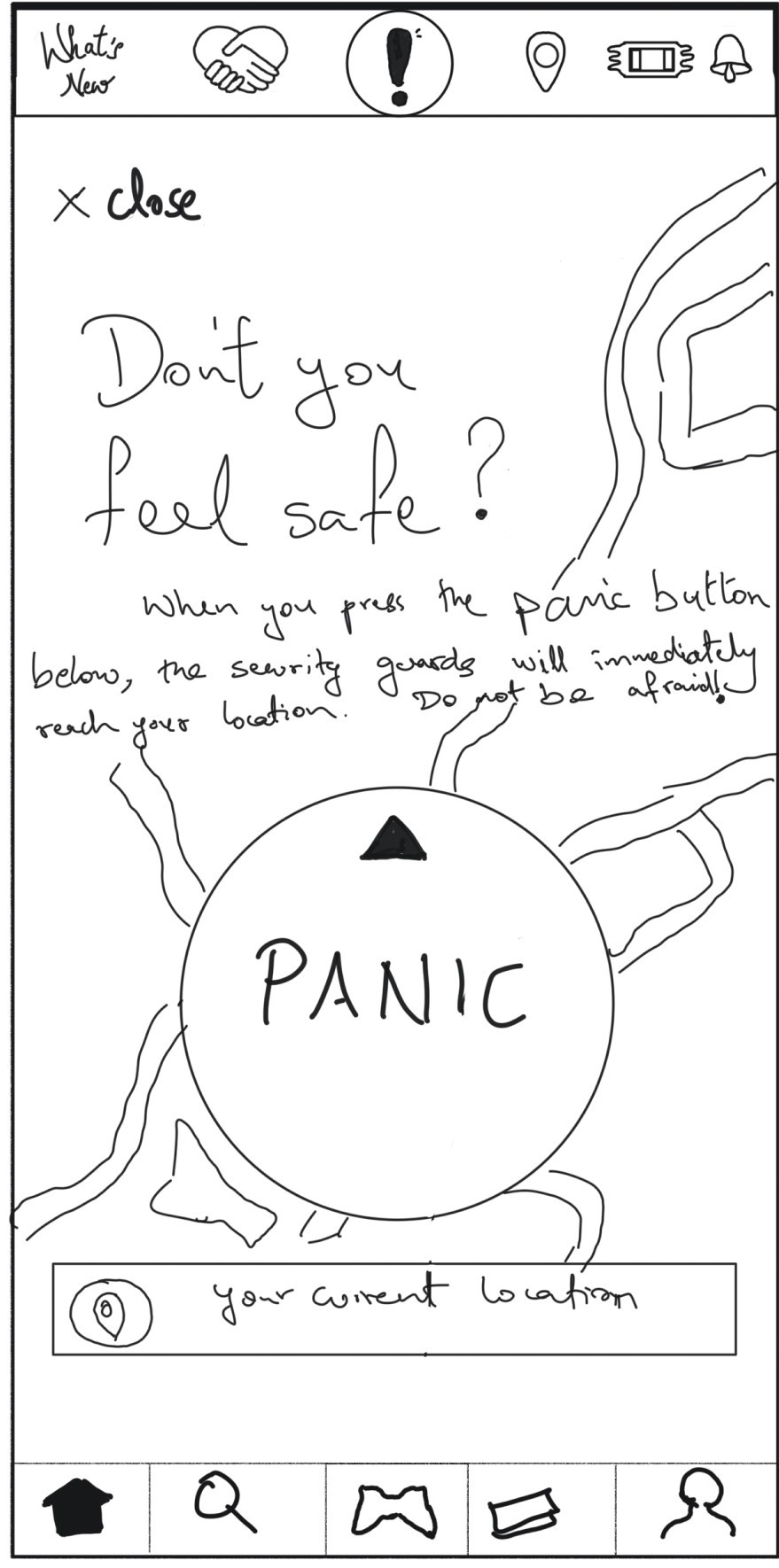 The panic button was designed with priority placement for quick access in emergencies. Its prominence and the use of an exclamation mark made it easy to spot and understand.