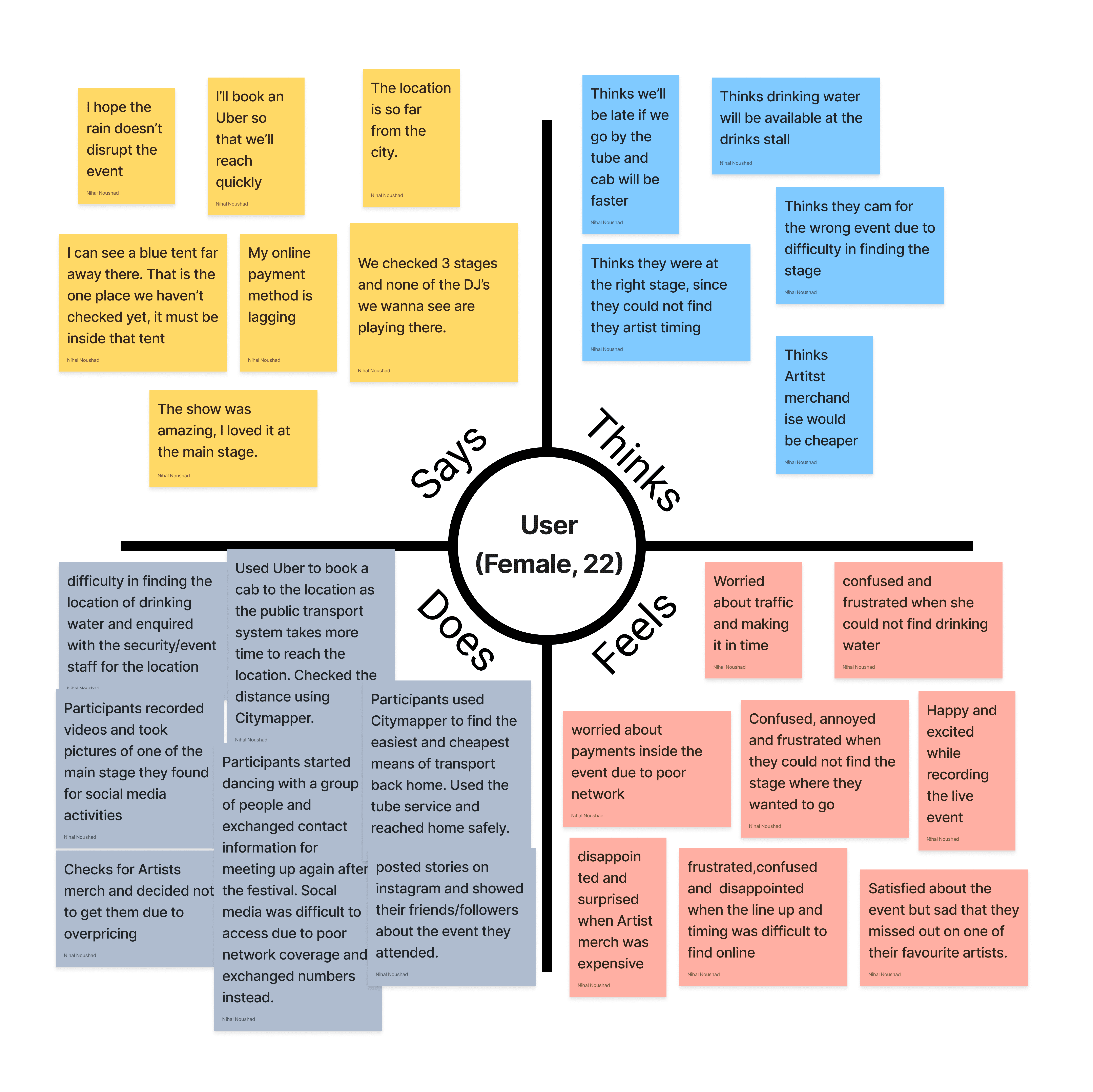 Following the observations at the Eastern Electric Music Festival, empathy maps were employed to delve into festivalgoers' experiences. This process involved analysing their actions, emotions, thoughts, and words, providing a comprehensive understanding of what drives attendees' behaviours and feelings.
