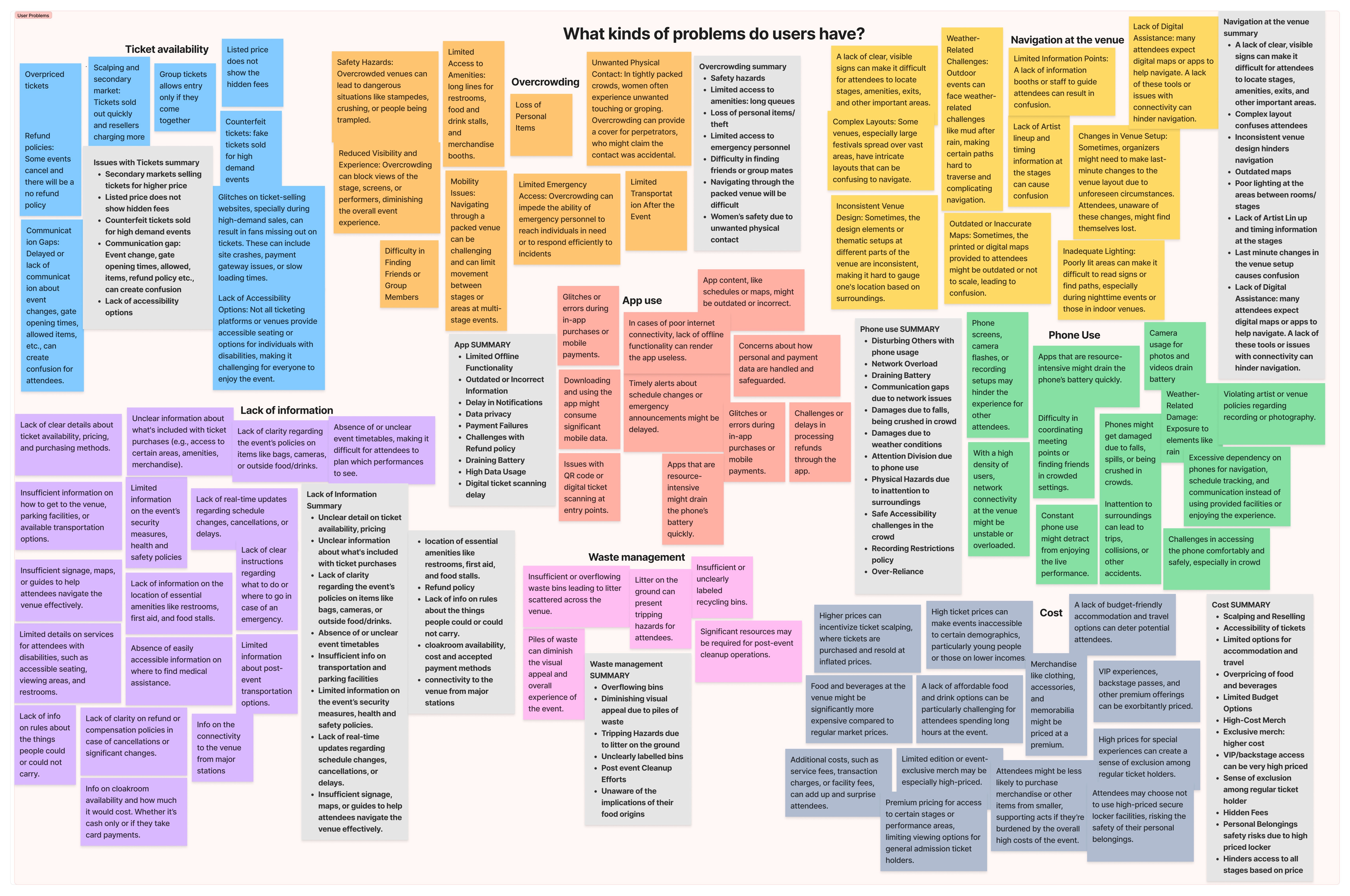 After creating empathy maps, I categorized the data and made the affinity diagram. To avoid bias, I used color-coded sticky notes, assigning specific colors to each topic's related insights. This approach helped me extract meaningful patterns and themes, guiding my design decisions.